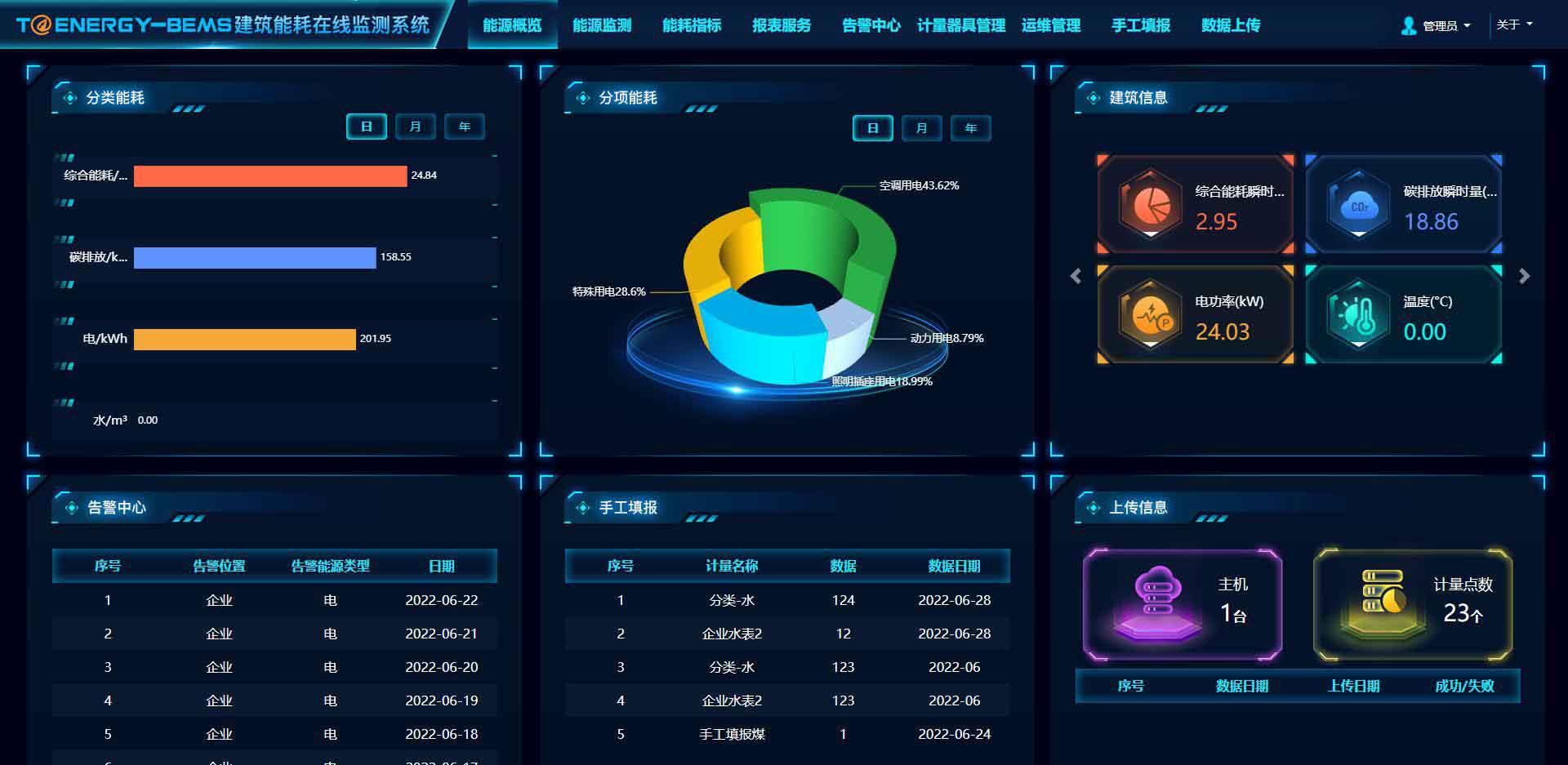 公共建筑能耗監測系統以可視化獨立分模塊的形式展示重點信息,包含有分類能耗統計、分項能耗統計、建筑信息、告警信息、手工填報信息、上傳信息等。
