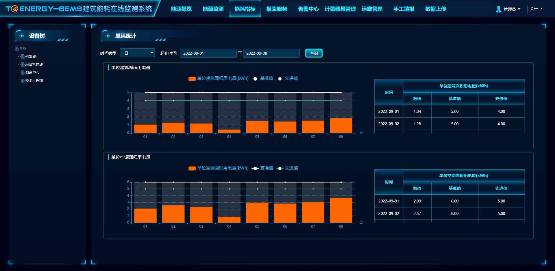 展示建筑體的分類分項能耗曲線圖、最值的數據和發生時間、以及負荷對比。