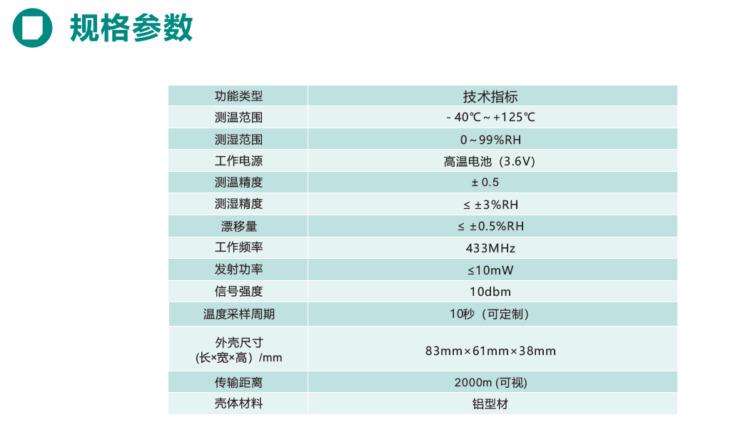 產品采用大容量電池供電方式,集成低功耗、抗干擾、無線加密、傳感技術于一體。產品結構材料選用熱穩定性高的鋁型材,保證了在復雜環境下工作的穩定性和可靠性。