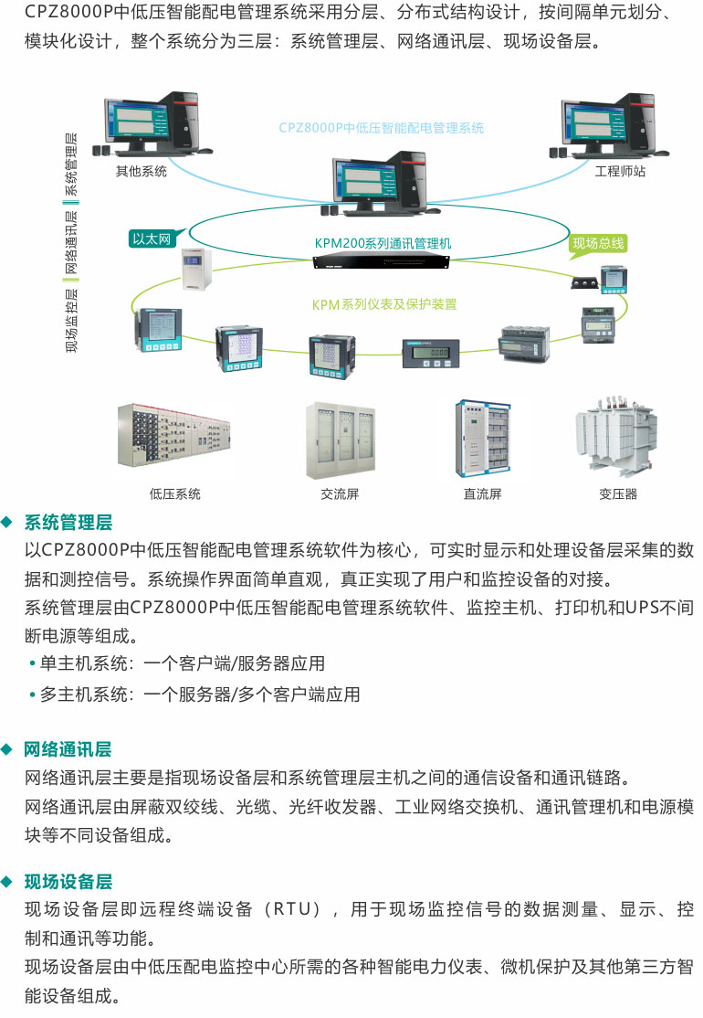 CPZ8000P中低壓智能配電管理系統(tǒng)采用分層、分布式結(jié)構(gòu)設(shè)計(jì),按間隔單元?jiǎng)澐帧⒛K化設(shè)計(jì),整個(gè)系統(tǒng)分為三層:系統(tǒng)管理層、網(wǎng)絡(luò)通訊層、現(xiàn)場(chǎng)設(shè)備層。