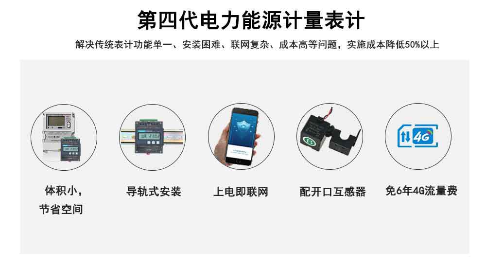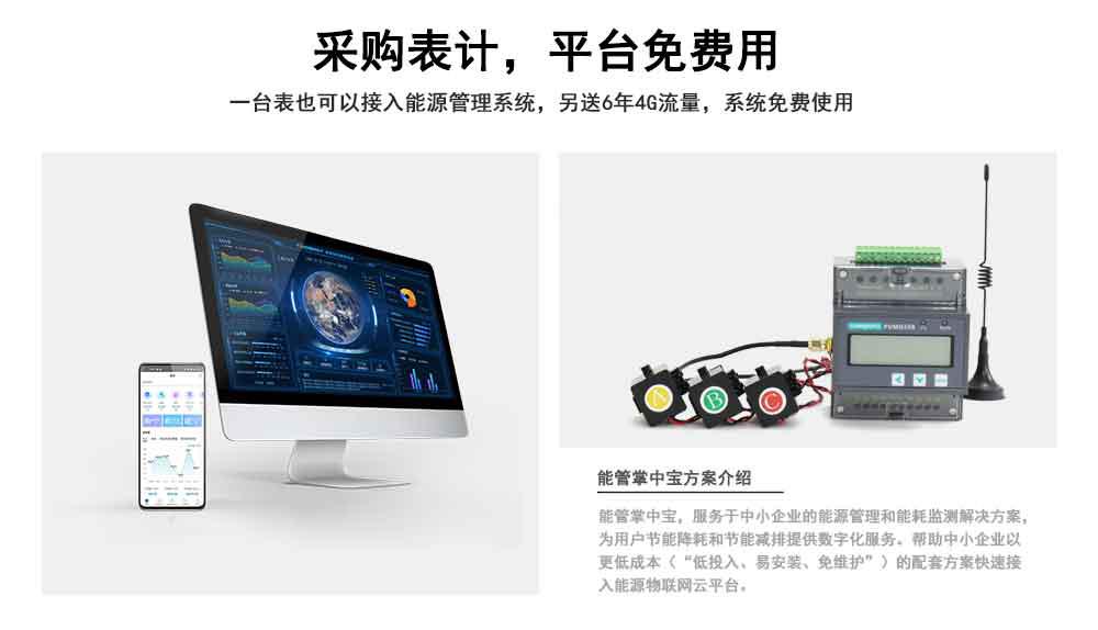 新型智能電表安裝方便,開口式互感器、免布線安裝,內置4G/GPRS無線模塊,無需額外配置采集設備, 使用戶可以低成本的應用我們的服務,購買電表還可免費贈送配套的能管掌中寶系統。