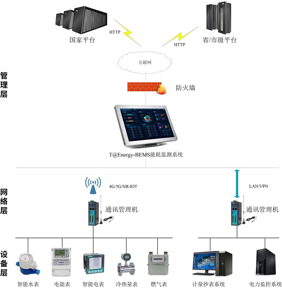 設備層:主要由電能表、水表、燃氣表、冷熱量、蒸汽表以及第三方監測系統組成。