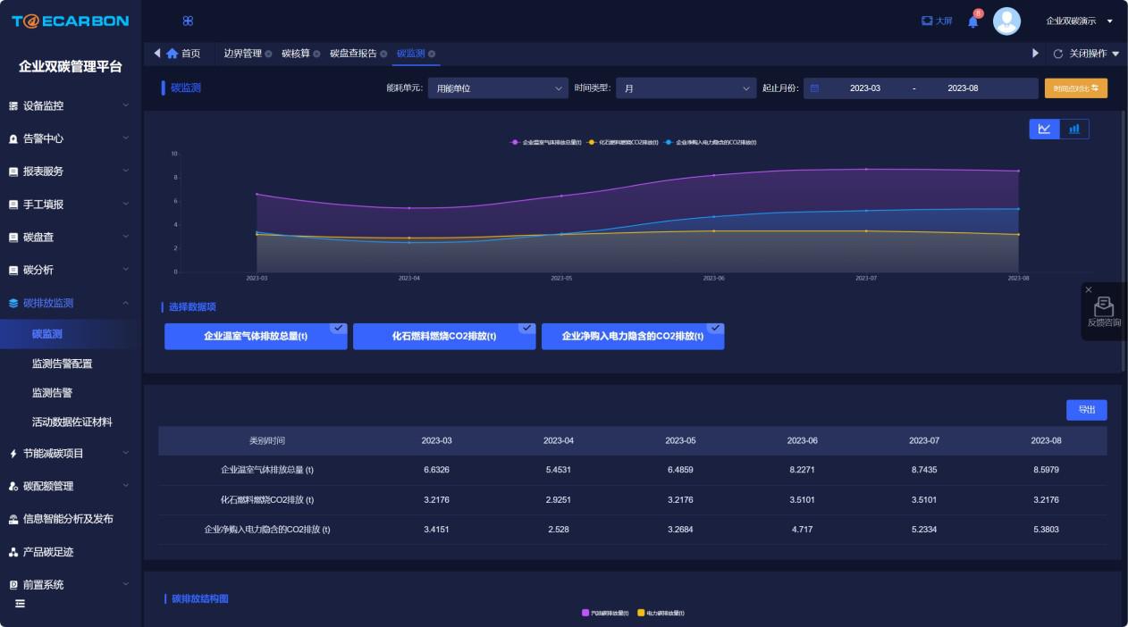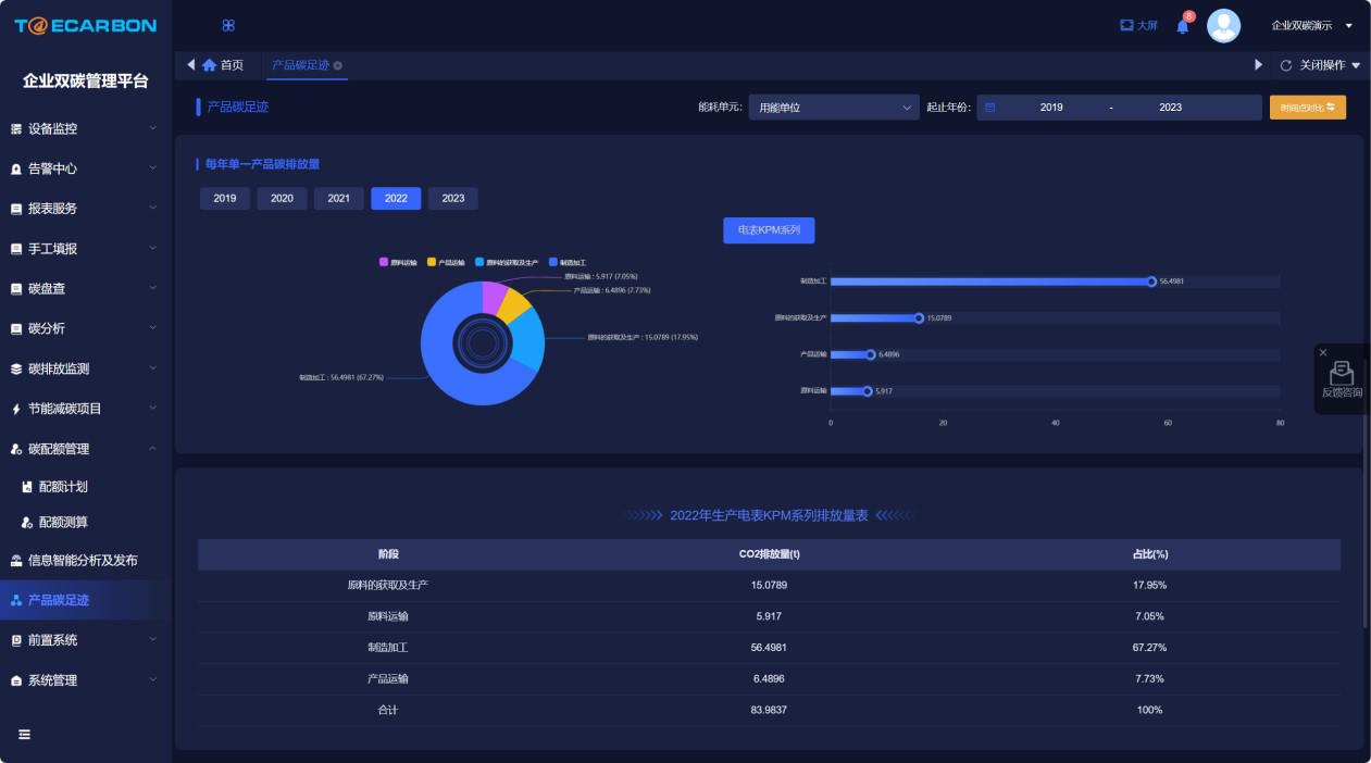 展示企業各個產品不同時間段的碳排放量以及每個產品各個階段的碳排放量。通過數字化、可視化的方式展示企業產品碳足跡,從而協助企業進行產品碳足跡認證工作。