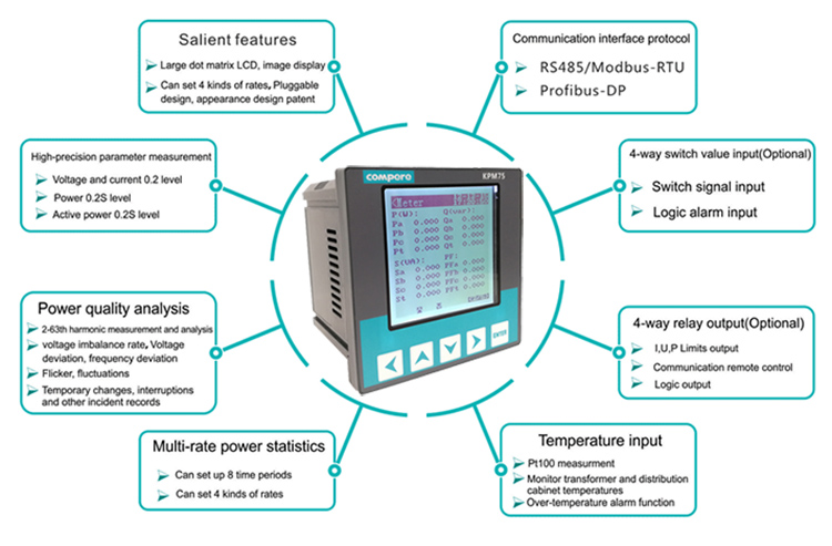 Voltage / current, active power, reactive power, apparent power, frequency, active energy |