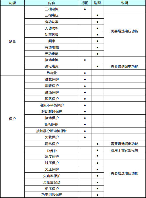 由于電動機應用的用途、性能、環境,因此電動機保護的功能種類和數量也有所差異。所以用戶在選擇電動機保護器功能時,可能在選擇保護功能時不盡相同。因此,康派智能從用戶的角度出發,避免在電動機保護器選型上的不便以及購買非必要功能造成的額外支出,康派智能編排了一個標準的電動機保護器的選型。