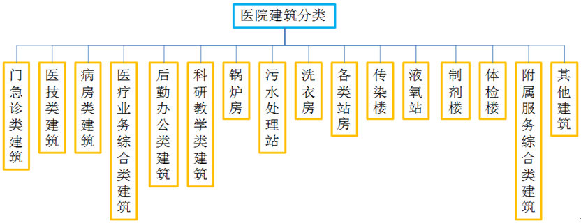 醫院建筑根據醫療用途可分為門診類建筑、醫技類建筑、病房類建筑、醫療業務綜合類建筑、后勤辦公類建筑、科研教學類建筑、鍋爐房、污水處理站、洗衣房、各類站房、傳染樓、液氧站、制劑樓、體檢樓附屬服務綜合類建筑等,如圖所示。