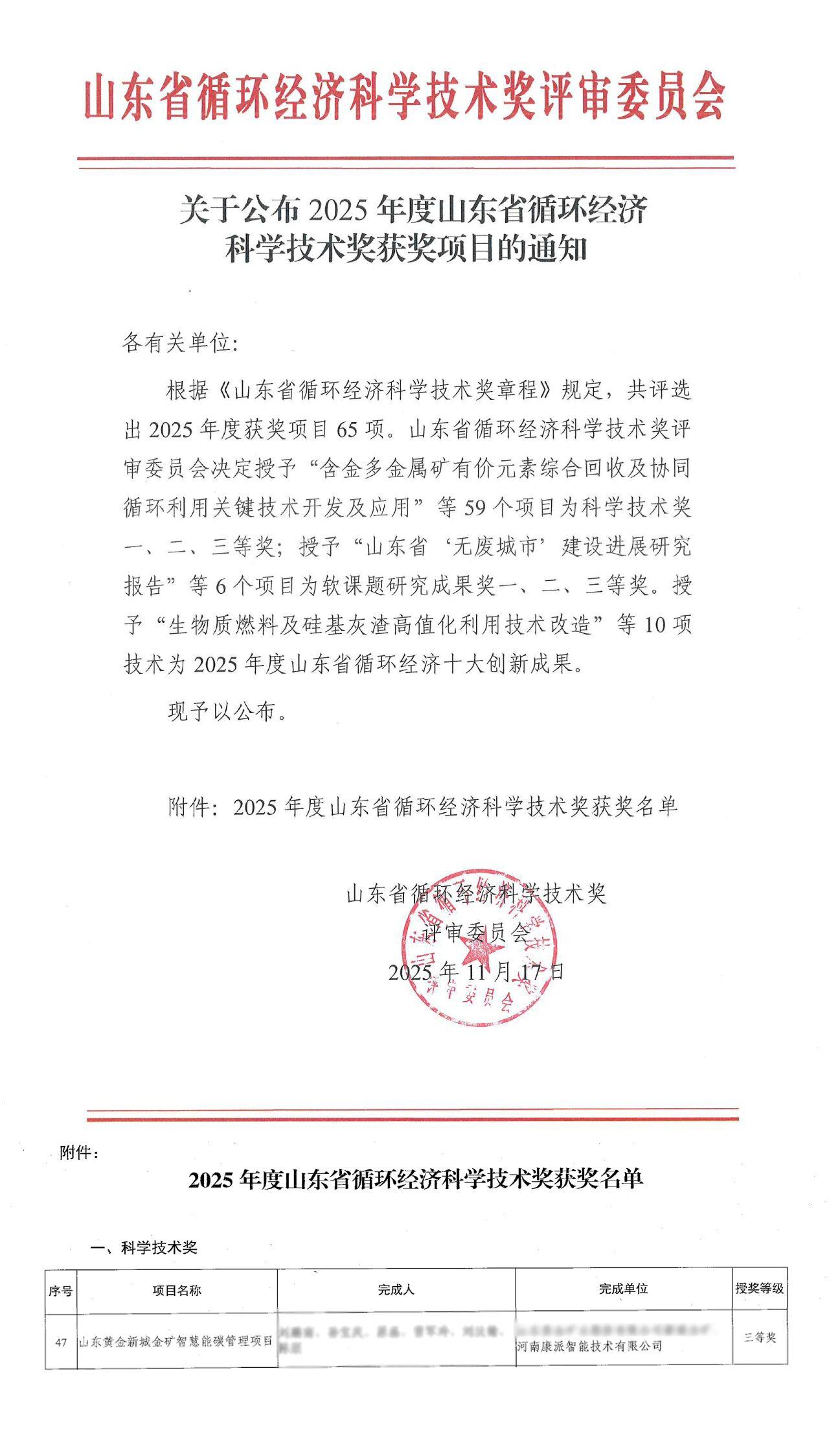 近日,2025 年度山東省循環經濟科學技術獎獲獎結果正式公布,河南康派智能技術有限公司申報的 “山東黃金新城金礦智慧能碳管理項目” 憑借突出的創新實踐與綠色成效,成功榮獲科學技術獎三等獎!