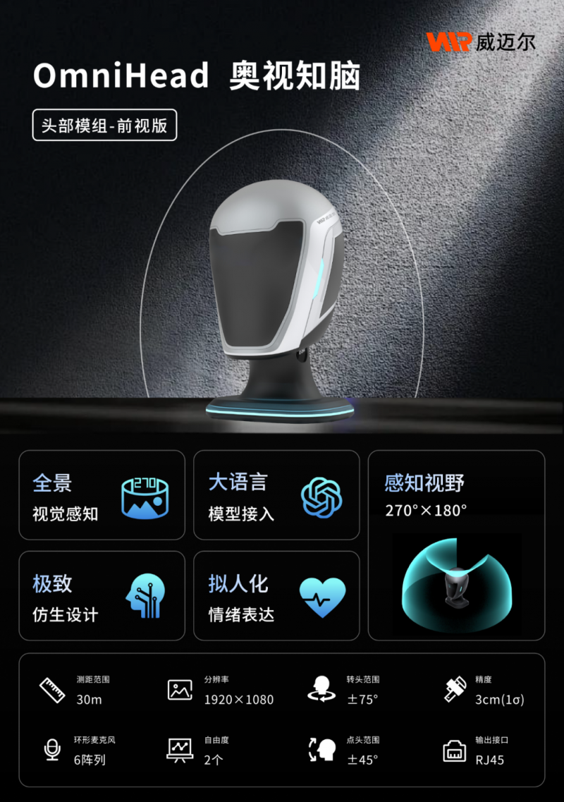 作為藍(lán)芯科技全資子公司,威邁爾科技依托在移動機器人領(lǐng)域多年的技術(shù)沉淀,將工業(yè)級感知能力下沉至人形機器人賽道,推出頭部模組OmniHead。該模組以多模態(tài)融合感知為核心、開放系統(tǒng)為支撐,不僅補齊當(dāng)前人形機器人在感知維度完整性與認(rèn)知決策深度上的關(guān)鍵短板,更構(gòu)建了可擴展、高兼容的感知基座,為具身智能規(guī)模化落地奠定基礎(chǔ)。